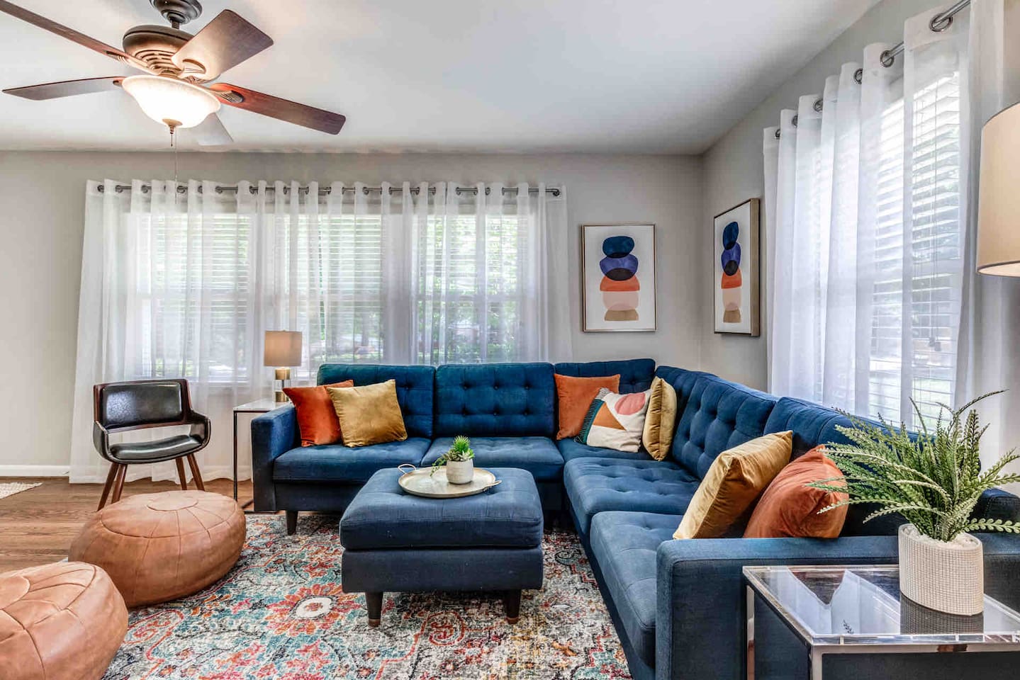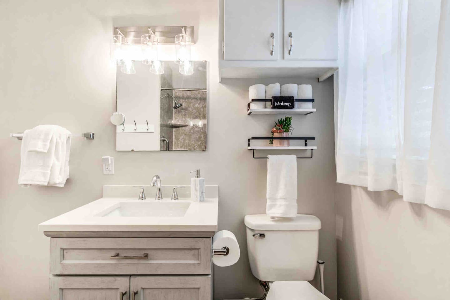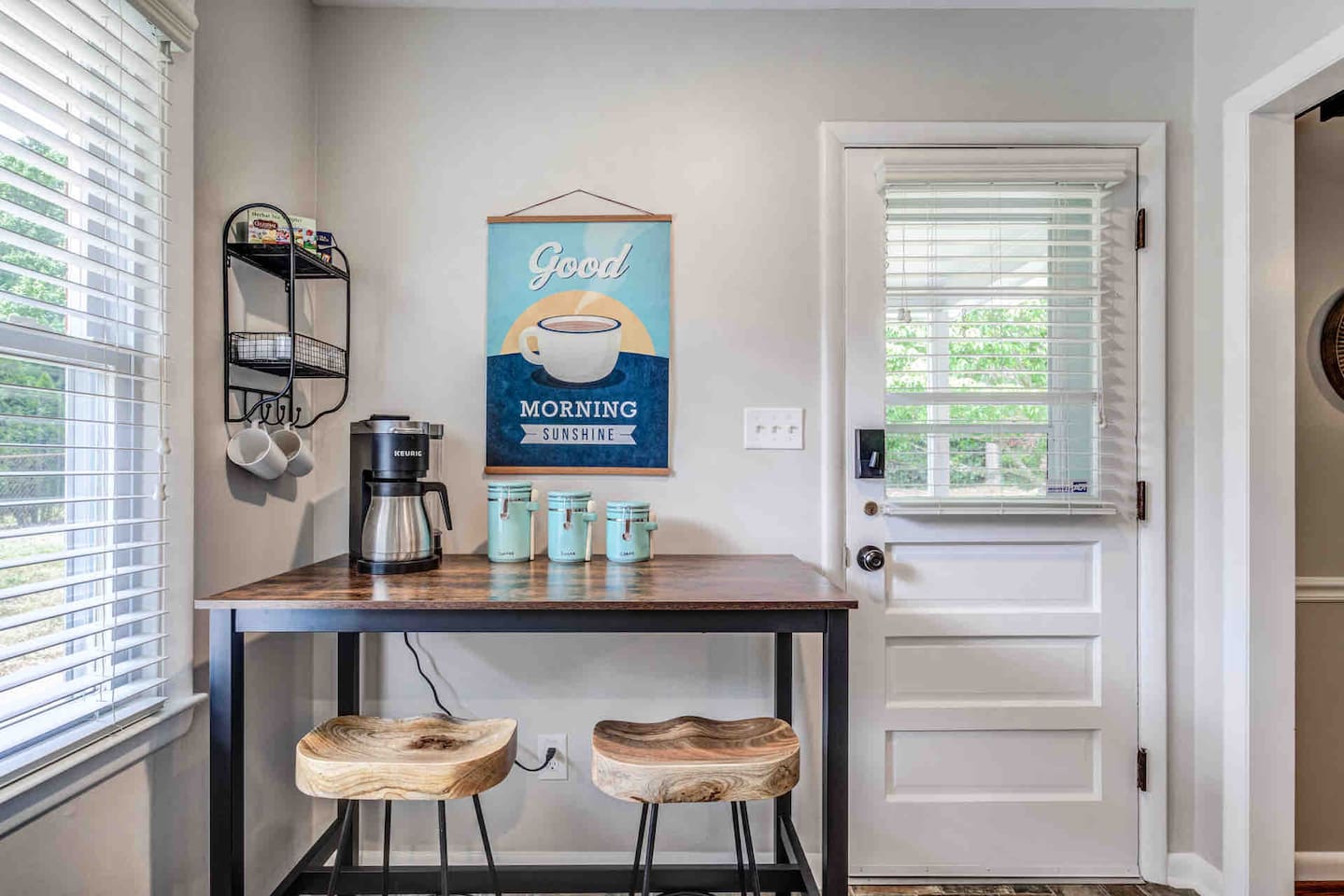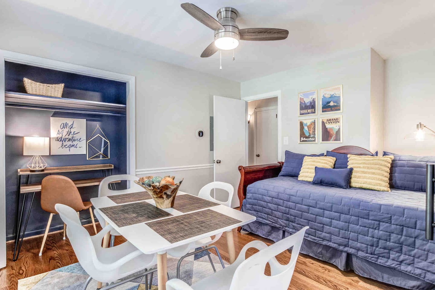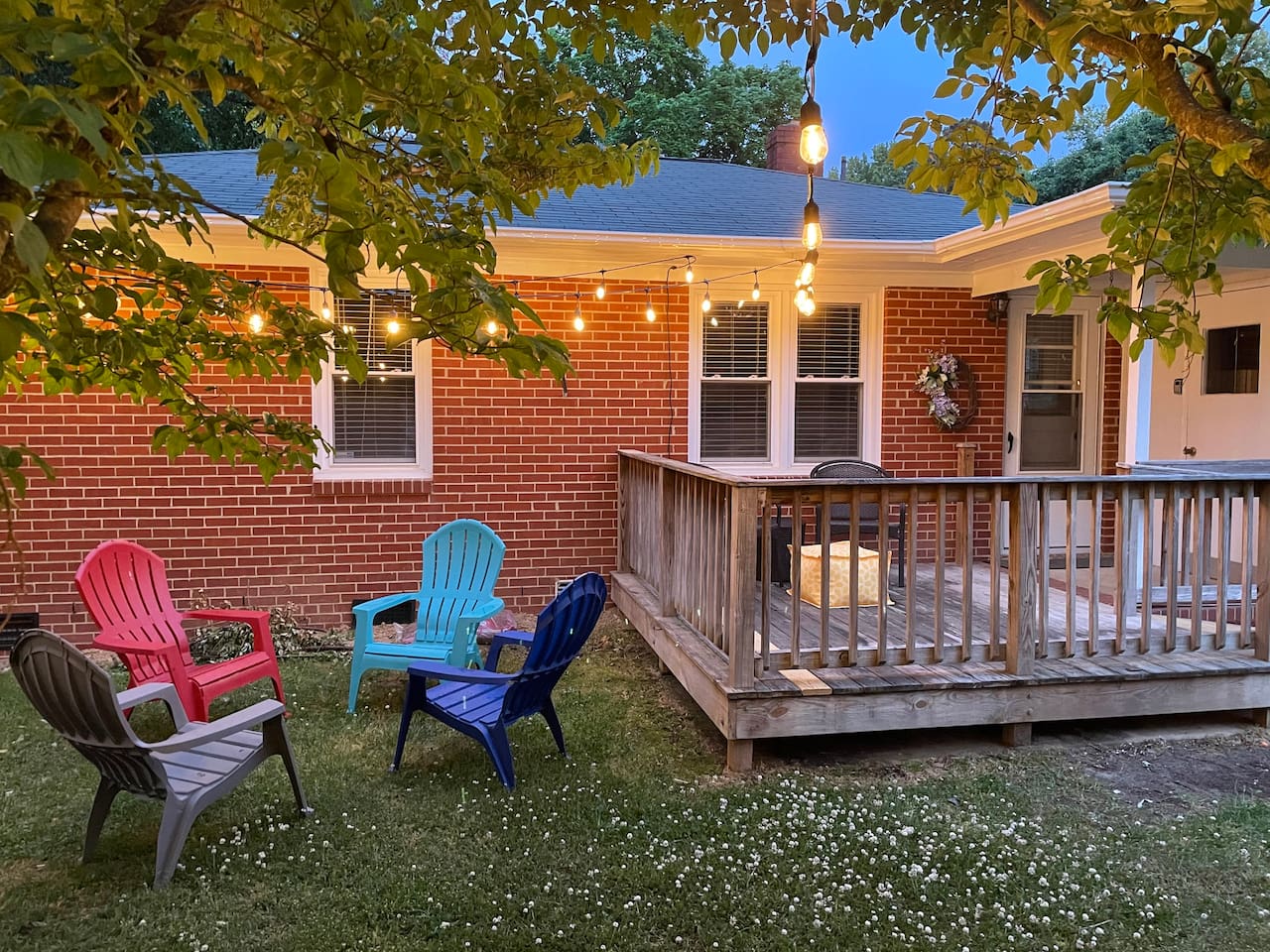 Savor your morning coffee from the rocking chair on the front porch. Eat lunch on the back deck overlooking the quiet back yard, or enjoy unwinding in the evening under the glow of the patio lights. Work from home in one of two desk areas equipped with fast internet. Bring your own login for the two Smart TV’s. Enjoy preparing meals in the fully equipped kitchen. Sit in the quaint breakfast nook that seats 2 or dine at the larger dining table that seats 4-6. Washer and dryer available for your laundry needs. Park up to 4 cars in the driveway. At the end of the day, retire into one of two spacious bedrooms which feature king sized beds and blackout curtains. The third sleeping area is multifunctional - it has a daybed and twin trundle, a dining table, and a desk area . A gorgeous barn door provides privacy making this area live like a third bedroom. Accessibility Info: All hardwood flooring, ranch home, low ramp at back entrance, grab bars in shower, low profile shower entrance with shower bench, no interior steps, minimal lips at flooring transitions, removable rugs, over 3" clearance under beds and sofa, 24" bed height, door are NOT wide enough for a standard wheelchair. Please message me with specific questions or for more pictures or clarification. **Love this property but the dates aren't available? Check my other listings for the same level of luxury and comfort!**