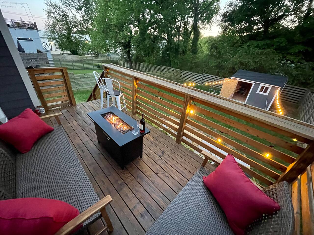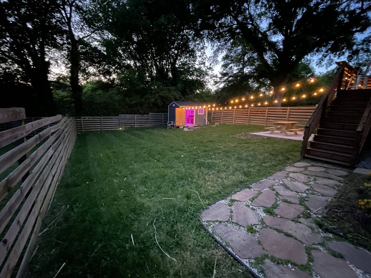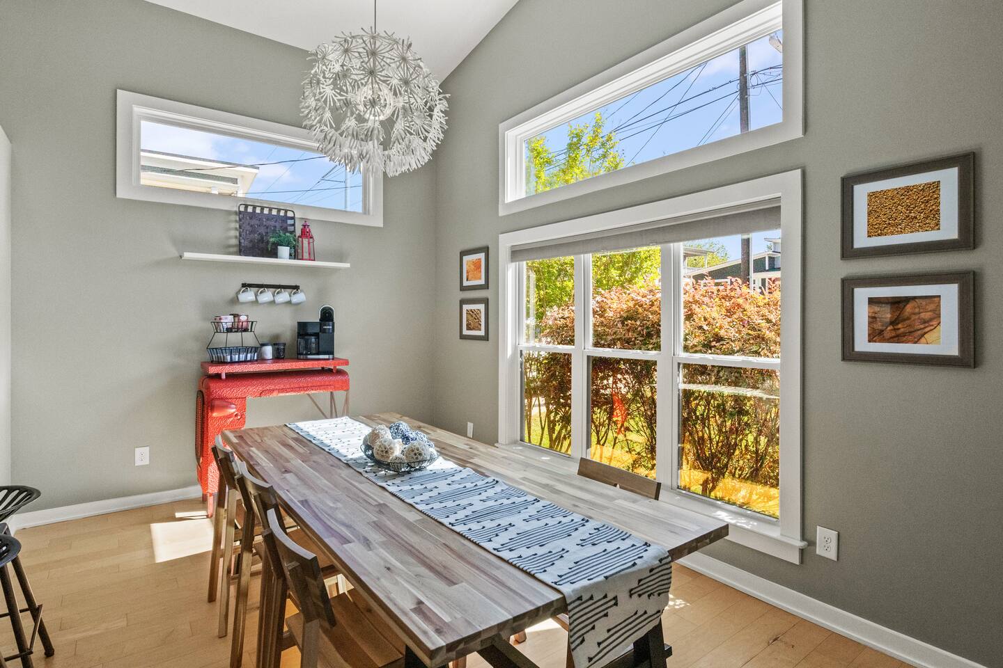 Savor your morning coffee from the chairs on the front porch. Eat lunch on the back deck overlooking the quiet back yard, or enjoy unwinding in the evening under the glow of the patio lights. Work from home in one of two desk areas equipped with fast internet. Bring your own login for the two Smart TV’s. Enjoy preparing meals in the fully equipped kitchen. Enjoy dinner with the family dining table that seats 6-8. Washer and dryer available for your laundry needs. Our house features three charming bedrooms: an NCSU themed bedroom, a Carolina Hurricanes themed bedroom, and a North Carolina State Fair themed bedroom. Each bedroom in our house features comfortable sleeping arrangements, with king beds in two rooms and a third bedroom with two twins and a twin trundle. We even provide a portable mattress and pack n play and booster seat/high chair. Pets and kids love our fenced backyard! The colorful LED lit game shed is equipped with many game favorites including Sauce Toss - a hockey styled cornhole game - fun for kids and adults. We have many things your pet may need such as a crate, food and water bowls, paw towels, and clean up bags. We offer parking for two cars in the driveway, and additional street parking is available. Our home is conveniently located close to downtown Raleigh in the South Park district, a neighborhood that is undergoing redevelopment. Our home is best suited for those who feel comfortable with a diverse culture and city living. Our house is walkable to Red Hat Ampitheater, Duke Energy Performing Arts Center, the Raleigh Convention Center, and Transfer Street Food Hall and much, much more! Many ride share services are available, too. We can't wait to welcome you to our wonderful city and charming abode! **Love this property but the dates aren't available? Check my other listings for the same level of luxury and comfort!**